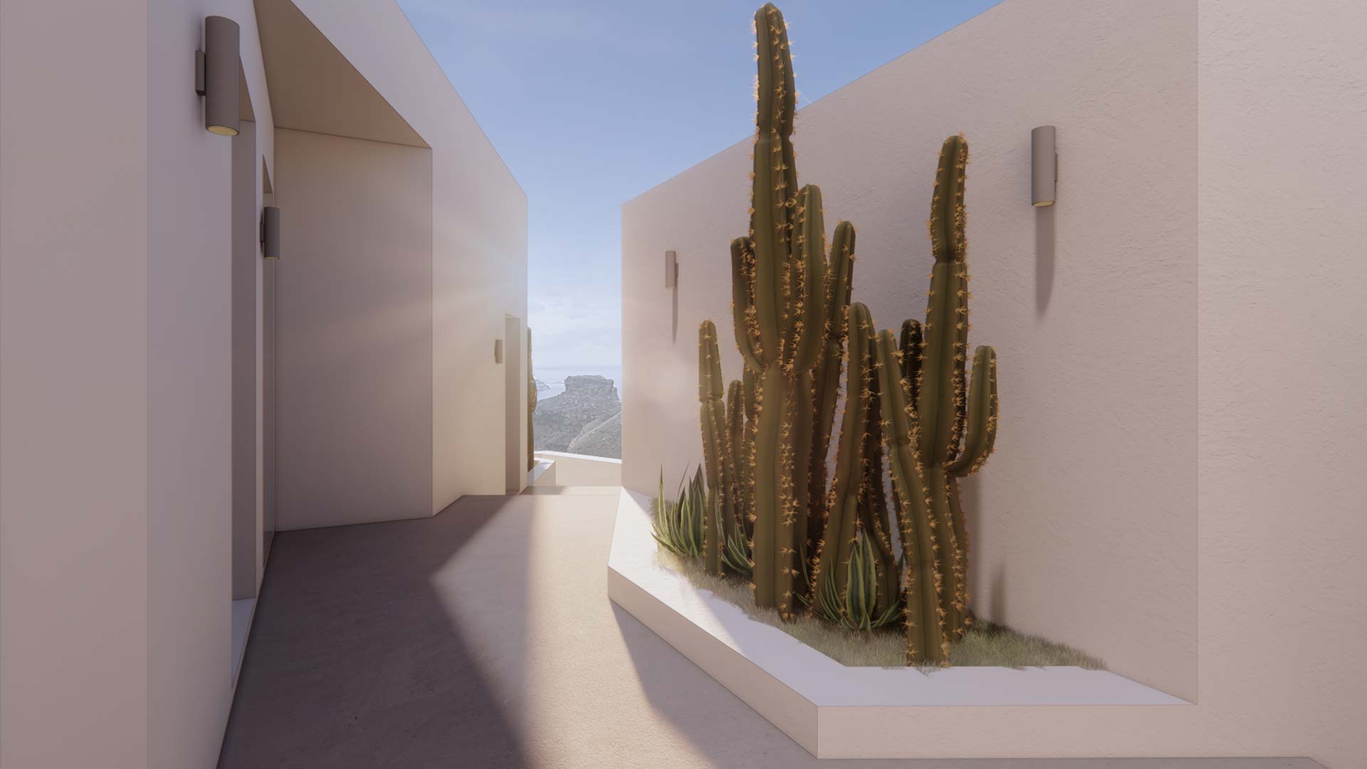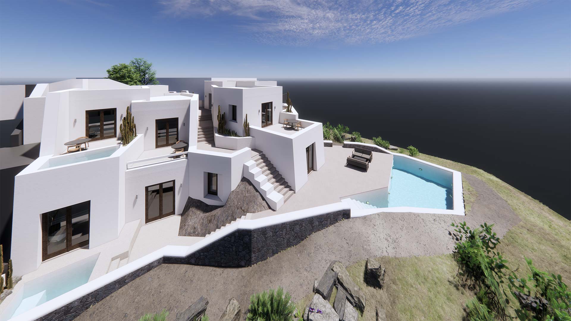 The study started in September 2019 and the construction will be completed in the summer of 2023. The building includes 7 suites and a restaurant. The starting point of the composition is the optimal adaptation of the building to the topography and its harmonization with both the natural and the structured environment of the settlement. The building is spread out on the plot following its shape. As a result, we have elevations in different orientations, thus taking advantage of the shape and location of the plot, which stands out on its west side to the cliffs and the view to the volcanic landscape.